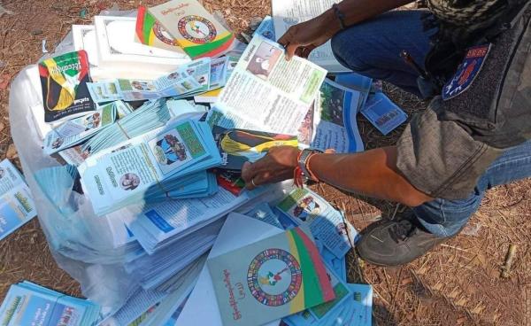 ခရီးသည်တင် မှန်လုံကားပေါ်မှ စစ်ကောင်စီ၏ ဝါဒဖြန့် စာစဉ်များကို သိမ်းဆည်းရမိပြီးနောက် မီးရှို့ဖျက်ဆီးခဲ့သည်ဟု ပုလောဒေသ ကာကွယ်ရေးတပ်ဖွဲ့ PRDF...