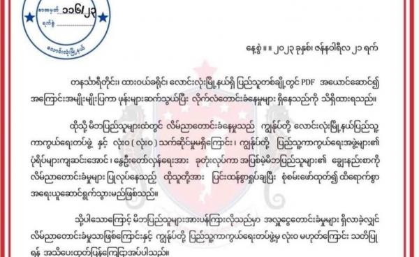 ပြည်သူ့ကာကွယ်ရေးတပ်ဖွဲ့ဝင် အယောင်ဆောင်ကာ ဖုန်းဆက်၍ အကြောင်းအမျိုးမျိုးပြပြီး ငွေကြေး တောင်းယူမှုများ ရှိနေသည်ဟု ပြည်သူ့ကာကွယ်ရေးတပ်ဖွဲ့ LLPDF က...
