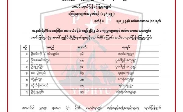 ထားဝယ်ခရိုင်အတွင်း သေနတ်နှင့် ပစ်ခံရပြီး သေဆုံးသူ ၇ ဦးမှာ ၎င်းတို့ လက်ချက်မဟုတ်ကြောင်း ပြည်သူ့ ကာကွယ်ရေး အဖွဲ့ PDF အဖွဲ့ လေးဖွဲ့က ပူးတွဲ ထုတ်ပြန်...