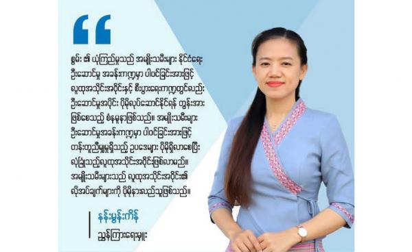 ယိင်းတိုင်း — လက်ရှိ နိုင်ငံရေးတွင် အမျိုးသမီးများပါတီဝင်မှု အခြေအနေများ၊ အမျိုးသမီးလွှတ်တော်ကိုယ်စားလှယ်များ၏ ဆောင်ရွက်ချက်များနှင့် အမျိုးသမီး၏...