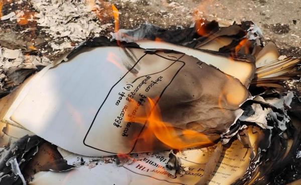 သျှမ်းပြည်မြောက်ပိုင်း သီပေါမြို့တွင် တိုင်းရင်းသား လူမျိုးများ သပိတ်စစ်ကြောင်းသည် ၂၀၀၈ အခြေခံ ဥပဒေ စာအုပ်ကို မီးရှို့ သရုပ်ပြသည့် လှုပ်ရှားမှု...