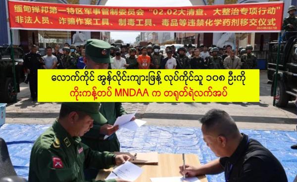 သျှမ်းပြည် လောက်ကိုင်မြို့တွင် အွန်လိုင်းကျားဖြန့် လုပ်ကိုင်သူ တရုတ်နိုင်ငံသား ၁၀၈ ဦးကို ကိုးကန့်တပ် MNDAA က တရုတ်ရဲထံသို့ လွှဲအပ်ပေးခဲ့ကြောင်း...