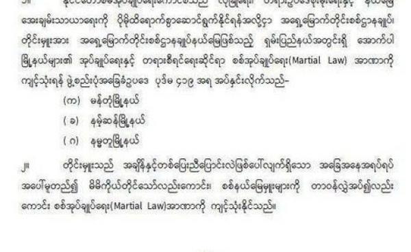တအာင်းအမျိုးသားလွတ်မြောက်ရေးတပ်မတော် (TNLA) ထိန်းချုပ်ထားသော မြို့နယ် ၃ မြို့နယ်ကို စစ်ကောင်စီက ယနေ့ (မတ်လ ၄ ရက် ) ည ၈ နာရီတွင် စစ်အုပ်ချုပ်ရေးကြေညာ...