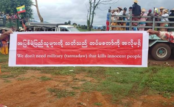 “အပြစ်မဲ့ ပြည်သူကို သတ်သည့် တပ်မတော် အလိုမရှိ” ဆိုသည့် စာတမ်းပါ ဗီနိုင်းပိုစတာကို ကိုင်ဆောင်ကာ ကျောက်မဲမြို့နယ် သျှမ်းလူထု တသောင်း ဆန္ဒထုတ်ဖော်မှု...