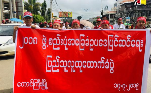 ၂၀၀၈ ဖွဲ့စည်းပုံအခြေခံဥပဒေပြင်ဆင်ရေး ပြည်သူလုထု ထောက်ခံပွဲကို တောင်ကြီးမြို့ တွင် ပြုလုပ်ရာ ဗိုလ်ချုပ်အောင်ဆန်းလမ်း (မင်းကျောင်းရှေ့)မှ...