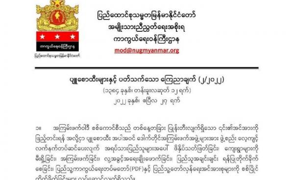 စစ်တပ်က လက်နက်တပ်ဆင်ထားပေးတဲ့ ပျူစောထီးနဲ့ ဒေါက်တိုင်အကြမ်းဖက်လက်နက်ကိုင်အဖွဲ့တွေ NUG ဆီ လက်နက်အပ်ဖို့ စာတစ်စောင် ဒီနေ့မှာထုတ်ပြန်လိုက်ပါတယ်။ NUG...
