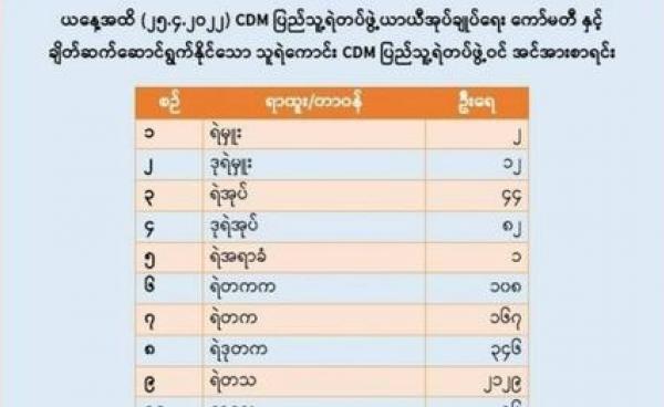 CDM ဝင်ထားတဲ့ ရဲတပ်ဖွဲ့ဝင် ၂၉၃၇ ဦးရှိနေပြီဖြစ်တယ်လို့ NUG က မနေ့က ဧပြီလ ၂၅ ရက်နေ့မှာ ထုတ်ပြောလာခဲ့ပါတယ်။ မြန်မာနိုင်ငံရဲတပ်ဖွဲ့ကနေ CDM ပြုလုပ်ထားတဲ့...