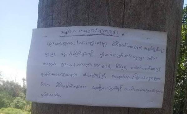 အင်းတော်ကြီးဒေသ မပြင်ကျေးရွာမှာ အုပ်ချုပ်ရေးမှူးတွေ နှုတ်ထွက်ဖို့နဲ့ သေနတ်သံတွေ ကြားရင် အပြင်မထွက်ကြဖို့ သတိပေးစာတစ်ခု မနေ့က မေလ (၈) ရက်နေ့မှာ...