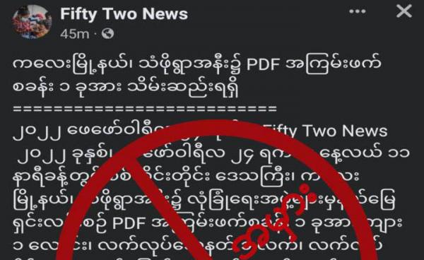 ဒီသတင်းအမှားကို Fifty Two News အကောင့်မှာ “ဖေဖော်ဝါရီ ၂၄ ရက်နေ့ နေ့လည် ၁၁ နာရီခန့်မှာ စစ်ကိုင်းတိုင်းဒေသကြီး၊ သံဖိုရွာအနီးမှာ လုံခြုံရေးအဖွဲ့များ...