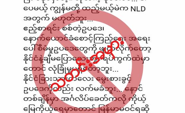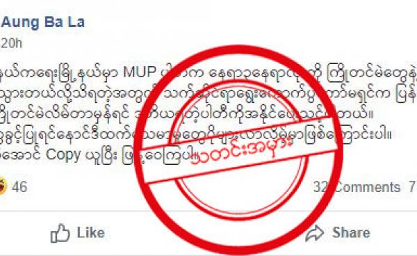 "NLD အစိုးရလက်ထက် ဖျက်ဆီးခဲ့သော နိုင်ငံတော်လုံခြုံရေးအတွက် အရေးကြီးသောဥပဒေများ" လို့ ခေါင်းစဉ်တပ်ထားတဲ့ အချက်အလက်မှားနေတဲ့ ပို့စ်တစ်ခု အောက်တိုဘာ ၃၁...