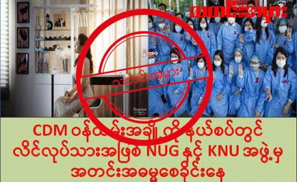 CDM လုပ်တဲ့ အမျိုးသမီး ဝန်ထမ်းတချို့ကို NUG နဲ့ KNU က တော်လှန်ရေး ရန်ပုံငွေအတွက်ဆိုပြီး လိင်လုပ်သား အဖြစ် အတင်းအဓမ္မ စေခိုင်းနေတယ်ဆိုတဲ့ သတင်းအမှား...