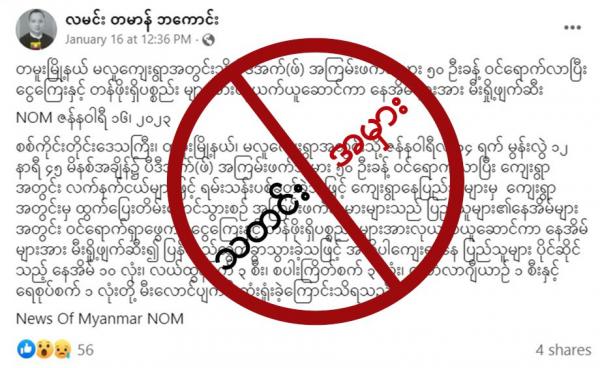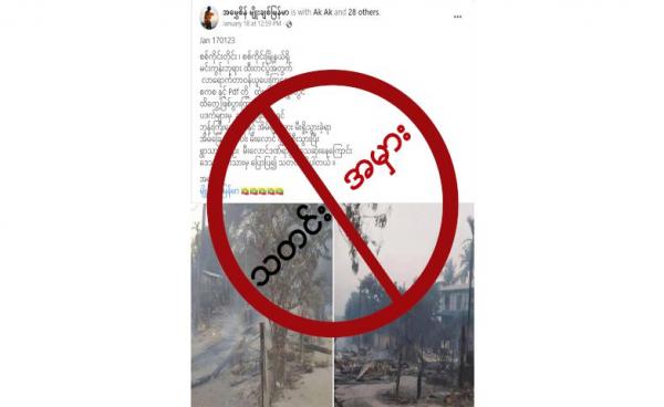 ဒီသတင်းအမှားကို လမင်းတမာန်ဘကောင်း ဆိုတဲ့အကောင့်ကနေပြီး “စစ်ကိုင်းတိုင်းဒေသကြီး၊ တမူးမြို့နယ်၊ မလူကျေးရွာအတွင်းသို့ ဇန်နဝါရီလ ၁၄ ရက် မွန်းလွဲ ၁၂ နာရီ...