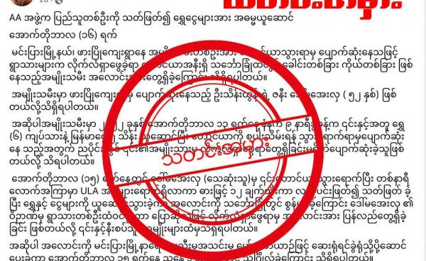 ဒီသတင်းအမှားကို Sakura Flower နဲ့ Golden Eyes ဆိုတဲ့ အကောင့်ကနေပြီး “AA လက်နက်ကိုင်အဖွဲ့အတွင်း အထက်အောက်ဖိနှိပ်အာဏာပြခံရခြင်း၊ မိဘများနှင့်...