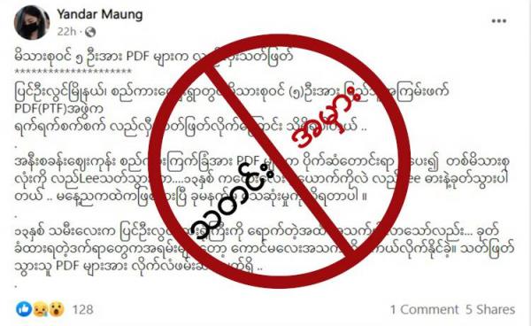 ဒီသတင်းအမှားကို ယိမ်းနွဲ့ပါး နဲ့ အရူးလွယ်အိတ် ဆိုတဲ့ Facebook အကောင့်ကနေ “ယော PDF အချင်းချင်းအဝေမတည့်ကာ ယော PDF တစ်ဉီးမှ ယော PDF ရုံးခန်းအား...