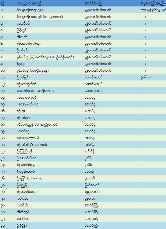 အင်းစိန်၊ အိုးဘို၊ တောင်ငူ၊ ပူတာအို၊ မြိတ်၊ ကသာ၊ ပြည်၊ တောင်ကြီး၊ ပုသိမ်၊ စစ်တွေ၊ သာယာဝတီ၊ စသည့်ထောင်များ မှ လွတ်ရက်စေ့နှင့် လွတ်ရက်နီး နိုင်ငံရေး အကျဉ်းသား စုစုပေါင်း ၃၃ ဦးကို စုံစမ်းစိစစ်ဆဲ အနေအထား အရ ဖေါ်ပြ လိုက်သည်။