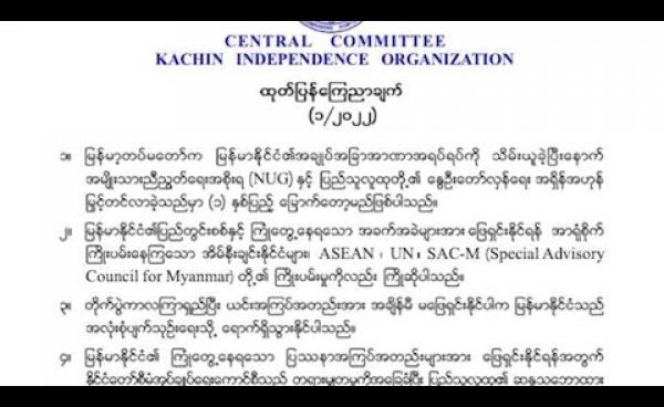 ကချင်လွတ်လပ်ရေးအဖွဲ့ KIO က သဘောထားရပ်တည်ချက်တစ်စောင် ထုတ်ပြန်ကြေညာခဲ့ပါတယ်။