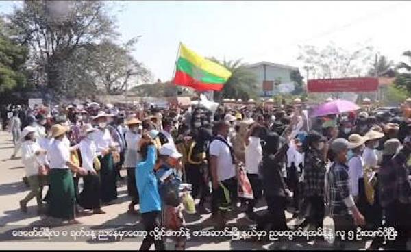 အာဏာသိမ်းတပ်မတော်ကို ဆန့်ကျင်တဲ့အနေနဲ့ တောင်ကြီးမြို့ခံတွေက သံအိုးသံပုံးတီးခေါက်၊ လက် ၃ ချောင်းထောင် ဖဲကြိုးနီလှုပ်ရှားမှု ပြုလုပ်နေပါတယ်။...