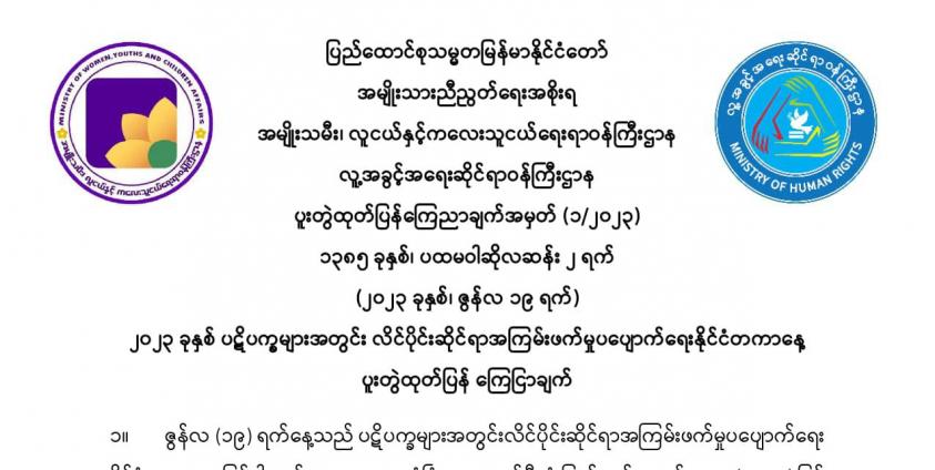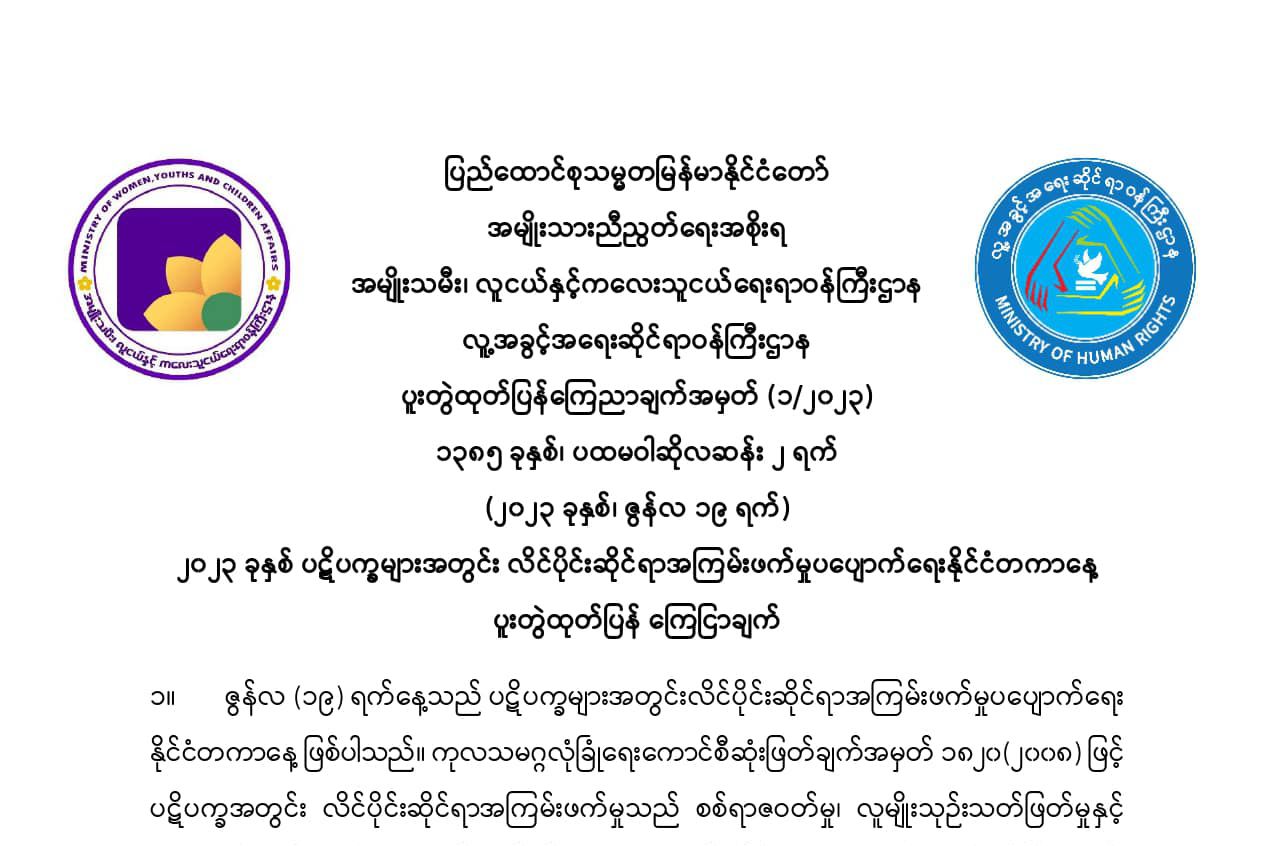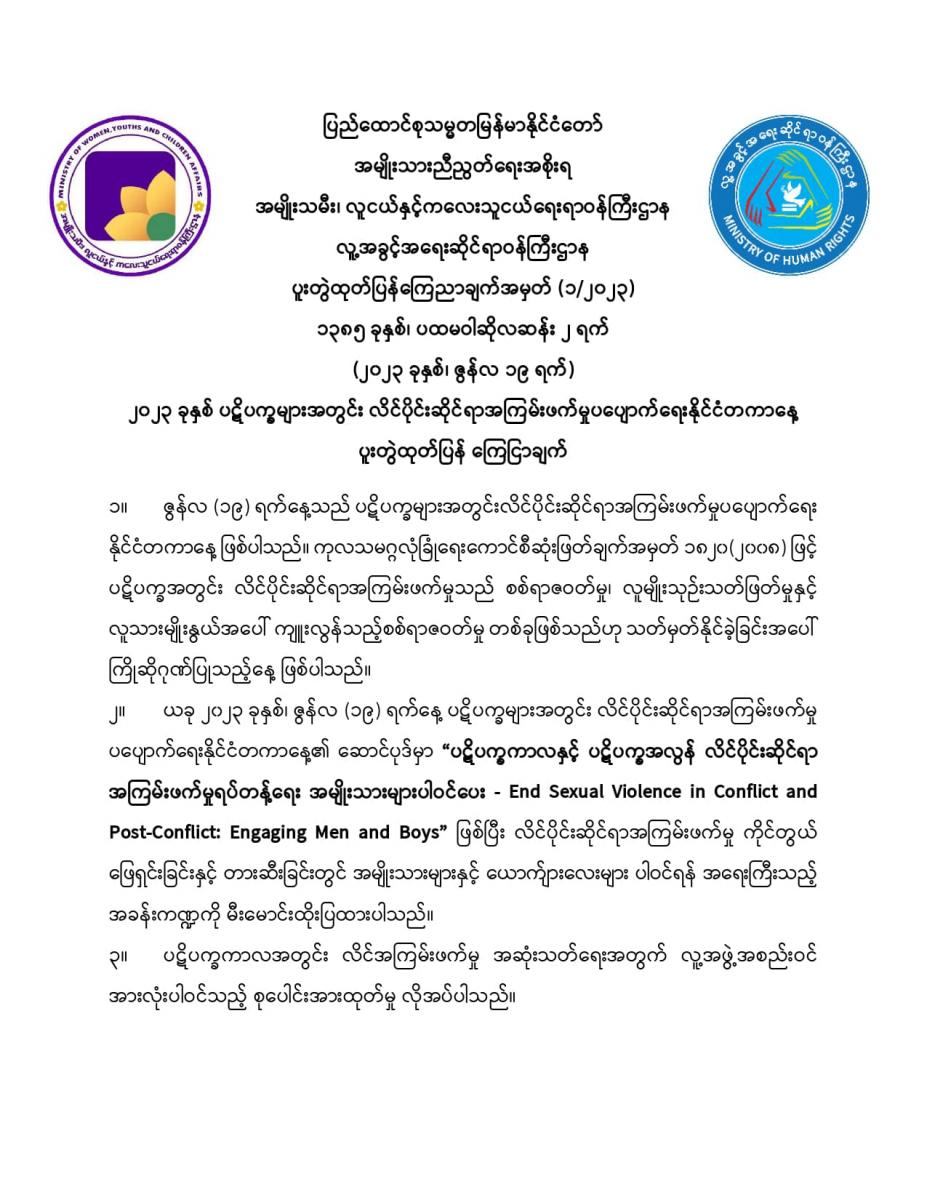 အာဏာသိမ်းကာလ နှစ်နှစ်ကျော်အတွင်း လိင်ပိုင်းဆိုင်ရာအကြမ်းဖက်မှု တိုင်ကြားချက် ၁၁၇ မှုကို လက်ခံ ရရှိကြောင်း အမျိုးသားညီညွတ်ရေးအစိုးရ (NUG)၊ အမျိုးသမီး၊ လူငယ်နှင့် ကလေးသူငယ်ရေးရာဝန်ကြီးဌာနနှင့် လူ့အခွင့်အရေးဆိုင်ရာဝန်ကြီးဌာနတို့မှ ဇွန်လ ၁၉ ရက်နေ့တွင် ပူးတွဲထုတ်ပြန်သည်။