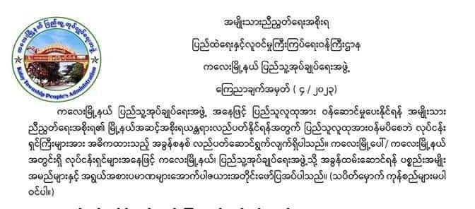 ကလေးမြို့နယ် ပြည်သူ့အုပ်ချုပ်ရေးအဖွဲ့ အနေနဲ့ ပြည်သူလူထုအား ဝန်ဆောင်မှုပေးနိုင်ဖို့နဲ့ အမျိုးသားညီညွတ် ရေး အစိုးရ ယန္တယား လည်ပတ်နိုင်ရေးအတွက် ပြည်သူလူထုကို ဝန်မပိစေဘဲ စီးပွါးရေးလုပ်ငန်းရှင်ကြီးတွေကို အဓိကထားကာ အခွန်စနစ် စတင်ဆောင်ရွက်လာတာ ဖြစ်ပါတယ်။
