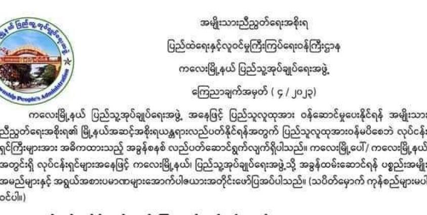 စစ်ကိုင်းတိုင်း၊ ကလေးမြို့ပေါ်နဲ့ ကလေးမြို့နယ်အတွင်းရှိ အခွန်မဆောင်သော လုပ်ငန်းရှင်တွေကို ဥပဒေနဲ့အညီ အရေး ယူဆောင်ရွက်မှု စတင်နေပြီလို့ ကလေးမြို့နယ် ပြည်သူ့အုပ်ချုပ်ရေးအဖွဲ့က ထုတ်ပြန်ပါတယ်။