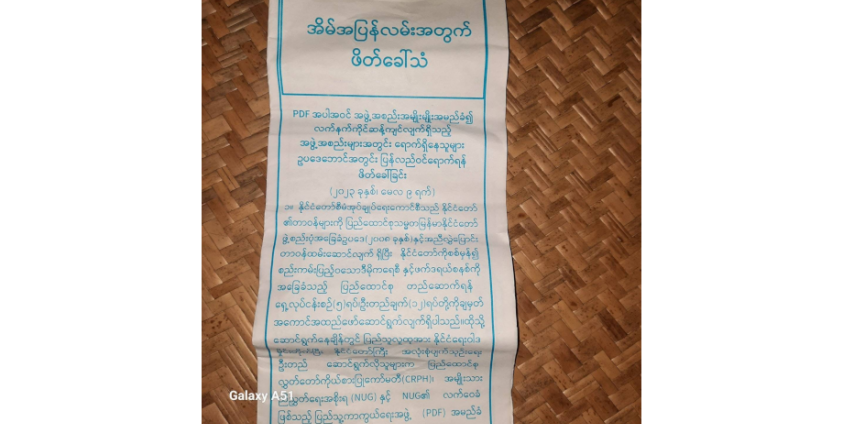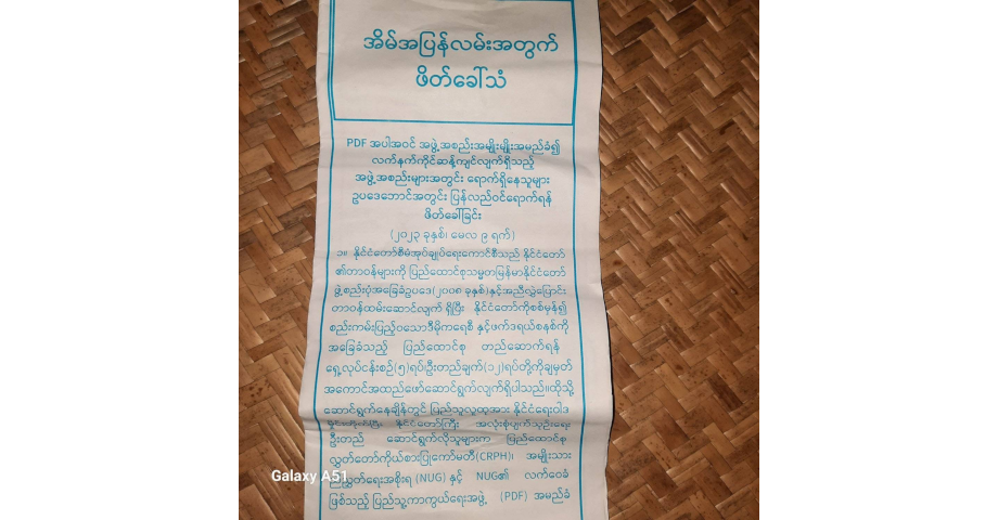 တနင်္သာရီတိုင်းဒေသကြီး၊ ကော့သောင်းမြို့ပေါ်တွင စစ်ကောင်စီ လက်အောက်ခံ အဖွဲ့အစည်းများမှ ပြည်သူ့ ကာ ကွယ်ရေး တပ်ဖွဲ့ဝင်များ (PDF) နှင့် လက်နက်ကိုင် အဖွဲ့အစည်းများကို ဥပဒေဘောင်အတွင်း ပြန်လည် ဝင် ရောက်လာရန်အတွက် လက်ကမ်းစာစောင်များဖြန့်ဝေလျက်ရှိကြောင်း ဒေသခံများကပြောသည်။
