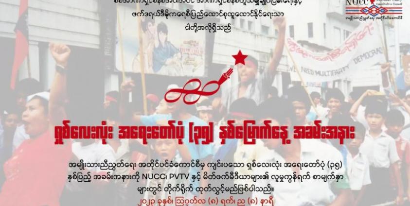 စစ်ကောင်စီကို စစ်မျက်နှာအစုံဖွင့်ကာ အဆုံးသတ်တိုက်ပွဲကို ဖြစ်နိုင်သမျှ နည်းနာ အစုံအလင်ဖြင့် ဆင်နွှဲနေကြ သည့် ကာလကို ရောက်ရှိလာပြီဖြစ်ကြောင်း အမျိုးသားညီညွတ်ရေးအစိုးရ (NUG) က ၃၅ နှစ်မြောက် ရှစ်လေး လုံး လူထုအရေးတော်ပုံ အထိမ်းအမှတ်အခမ်းအနားများသို့ ပေးပို့သည့်သဝဏ်လွှာတွင် ဖော်ပြထားသည်။
