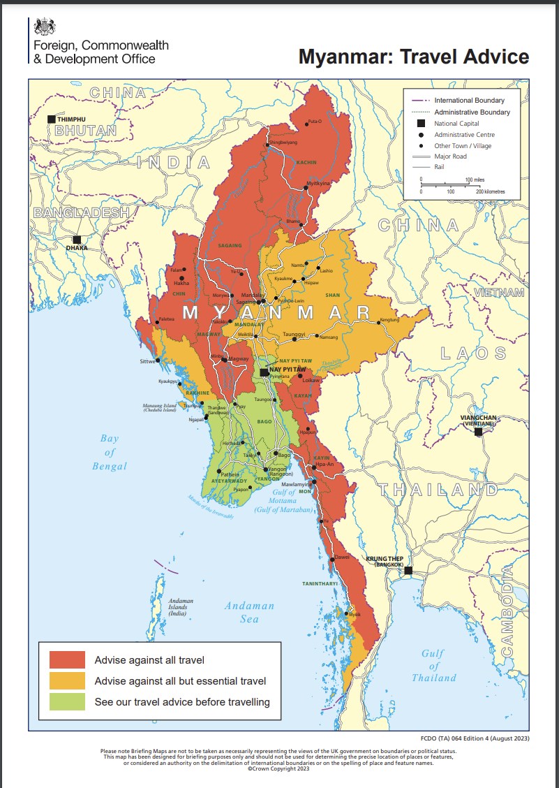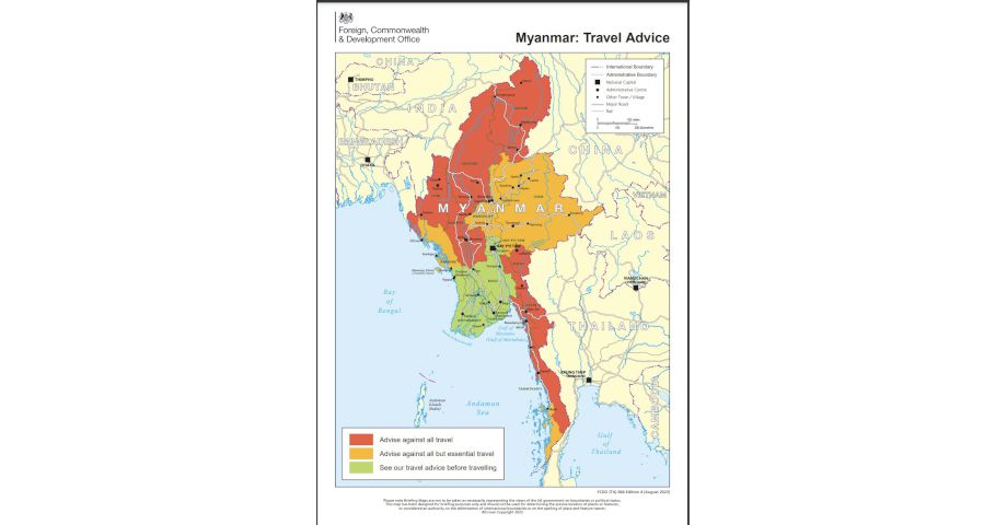 ပြီးခဲ့သည့် ဇန်နဝါရီ ၁၆ ရက်တွင်လည်း မြန်မာနိုင်ငံရှိ တိုင်းနှင့်ပြည်နယ် ၈ ခုမှ ဒေသအများအပြားသို့ ခရီးသွား လာခြင်း မပြုကြရန် ဗြိတိန်အစိုးရ (FCDO) က သတိပေးထုတ်ပြန်ခဲ့သေးသည်။
