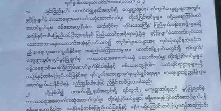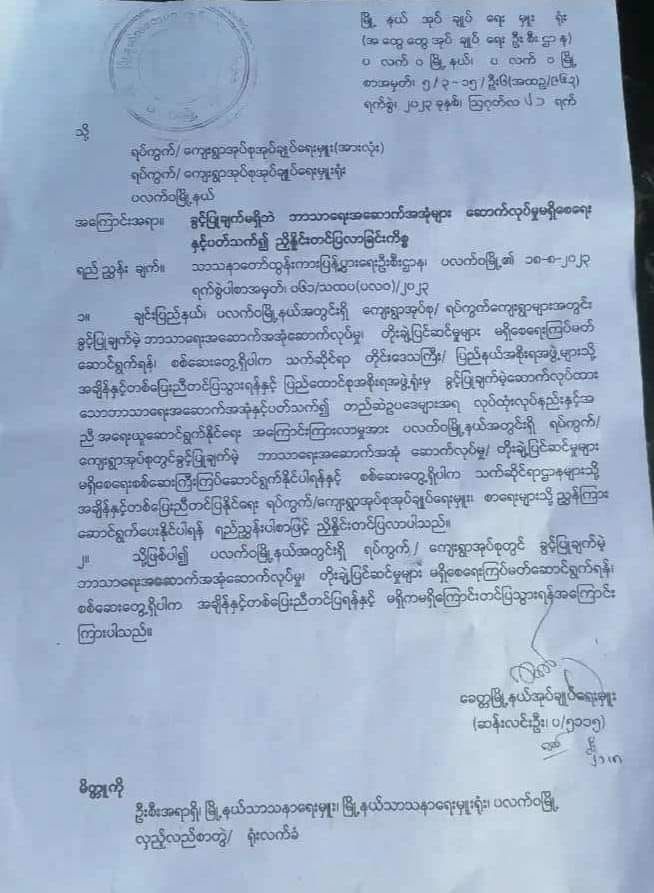အဆိုပါကိစ္စနှင့်ပတ်သက်၍ ပလက်၀မြို့နယ်အုပ်ချုပ်ရေးမှူးရုံးကတဆင့် ပလက်၀မြို့နယ်အတွင်းရှိ ရပ်ကွက်နှင့် ကျေးရွာ အုပ်စု အုပ်ချုပ်ရေးမှူးများထံ ပြီးခဲ့သည့် ဩဂုတ်လ ၂၁ ရက်နေ့က အသိပေးညွန်ကြားလာခဲ့ခြင်း ဖြစ် သည်။