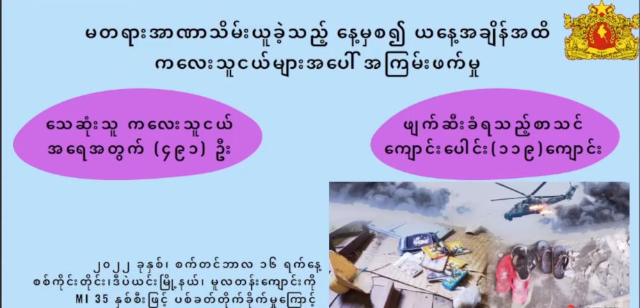 ဆရာမ (၁) ဦးနှင့် ကျောင်းသား၊ ကျောင်းသူ (၂၀) ဦးထက် မနည်း ထိခိုက်ဒဏ်ရာ ရရှိခဲ့သည့် အဆိုပါ စာသင် ကျောင်း ဖြစ်စဥ် အပါအဝင် အာဏာသိမ်းကာလအတွင်း စစ်ကောင်စီက အကြမ်းဖက်မှုကြောင့် တစ်နိုင်လုံးတွင် သေဆုံးရသူကလေးသူငယ်ပေါင်း ၅ ရာနီးပါးရှိနေသလို စာသင်ကျောင်းပေါင်း (၁၁၉) ကျောင်းလည်း ဖျက်ဆီးခံ လိုက်ရသည်ဟု NUG ၏ လူ့အခွင့်အရေးဆိုင်ရာဝန်ကြီးဌာန ပြည်ထောင်စုဝန်ကြီး ဦးအောင်မျိုးမင်းက ပြော သည်။