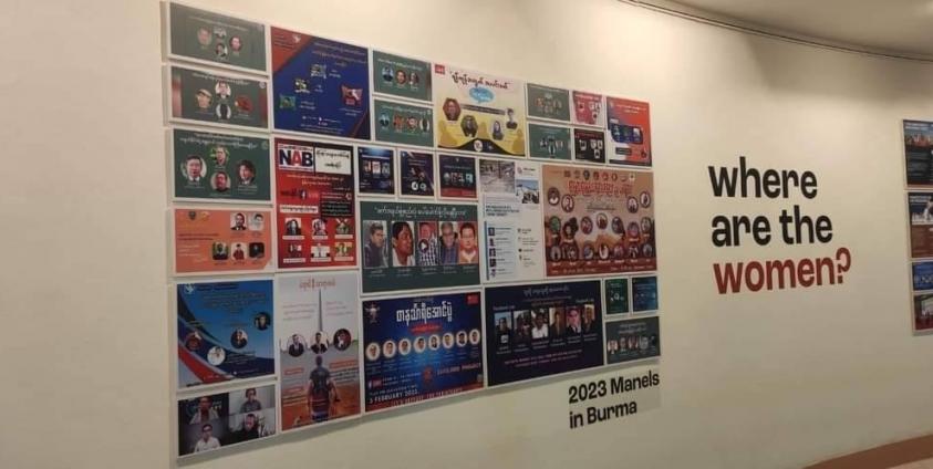“ဆုံးဖြတ်ချက်ချတဲ့ လုပ်ငန်းစဉ်တိုင်းမှာ အမျိုးသမီးတွေ အနည်းဆုံး ၃၀ ရာခိုင်နှုန်း ပါဝင်မှုပေါ့နော်၊ ပိုစတာမှာ ပါတဲ့အနီရောင်အစက်တွေက အဲ့ဒါကိုပြောတာ။ Where are the Women? အမျိုးသမီးတွေ ဘယ်မှာလဲ ဆိုတဲ့ မေးခွန်းကို ထုတ်ချင်တာ၊ အဲ့ဒါကို ထုနဲ့ထည်နဲ့ ပြချင်တာ” ဟု ယိင်းလောဝ်က ပြောသည်။