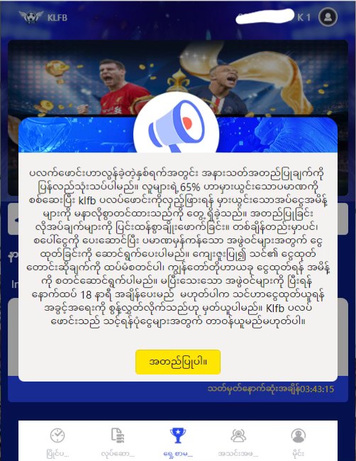 ပြီးခဲ့သည့် အောက်တိုဘာလ ၁၃ ရက်နေ့မှ စပြီး KLFB အွန်လိုင်းဂိမ်း အကောင့်ထဲရှိ ငွေများကို ထုတ်ယူ၍ မရ တော့ဘဲ အောက်တိုဘာလ ၁၉ ရက်နေ့တွင် KLFB ဂိမ်းအကောင့်ထဲရှိ ငွေပမာဏ၏ ၅ ရာခိုင်နှုန်းကို ၄၈ နာရီ အတွင်း ထည့်သွင်းပေးမှသာ လက်ကျန်ငွေများ ထုတ်ပေးမည်ဟု ကြေညာခဲ့သော်လည်း အမှန်တကယ် ထုတ်ယူ နိုင်ခြင်း မရှိခဲ့ကြောင်း ဂိမ်းဆော့ကစားသူများက ဆိုသည်။