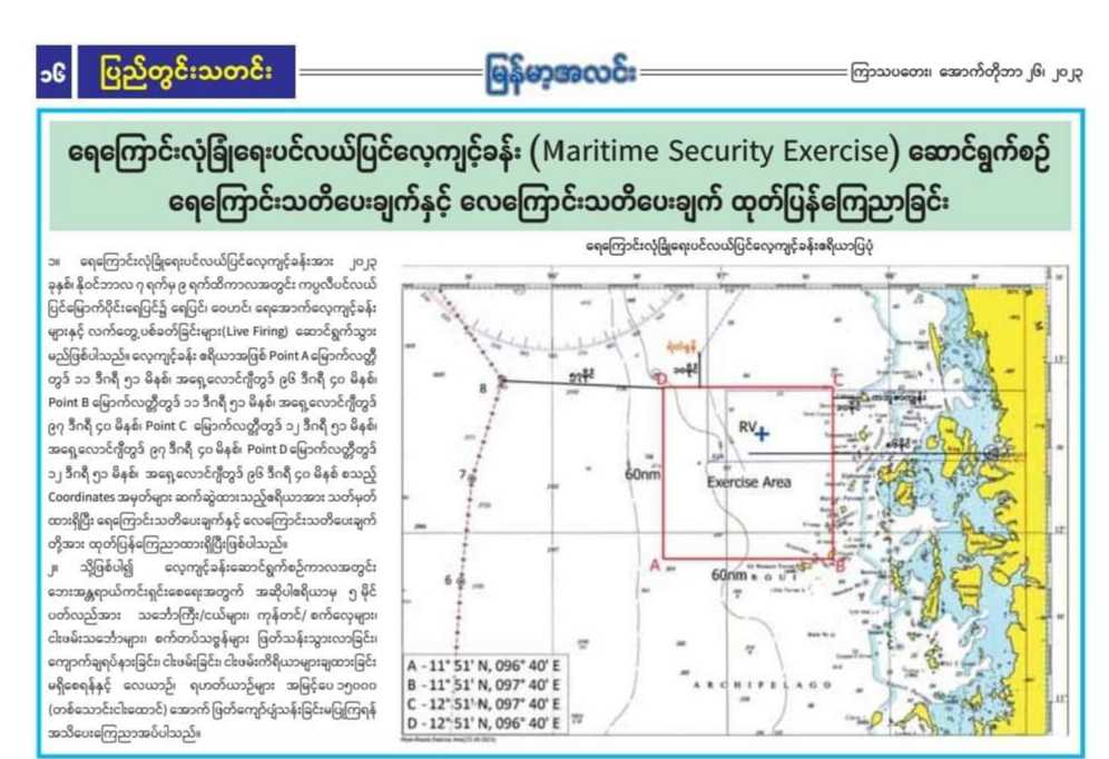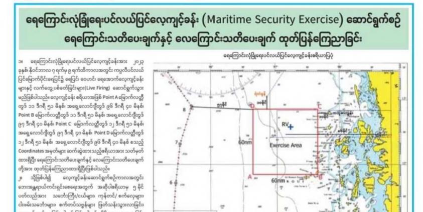 တနင်္သာရီကမ်းရိုးတန်း မြိတ်ကျွန်းစုအနီး ပင်လယ်ပြင်တွင် ရေကြောင်းလုံခြုံရေး ပင်လယ်ပြင်လေ့ကျင့်ခန်း Maritime Security Exercise ပြုလုပ်သွားမည် ဖြစ်ကြောင်း ရေကြောင်း သတိပေးချက်နှင့် လေကြောင်းသတိ ပေးချက်များကို စစ်ကောင်စီမှ ထုတ်ပြန်ထားသည်။