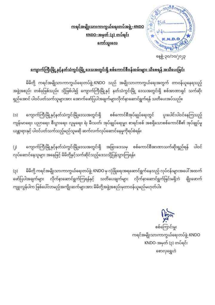 KNDO ၏ ထုတ်ပြန်ချက်ထဲတွင် စစ်ကောင်စီ သက်ဆိုးရှည်စေမည့် အုပ်ချုပ်မှုယန္တရားတွင် ပါဝင်ပတ်သက် သူများအနေဖြင့် လုပ်ငန်းများမှ ရပ်နားပြီး မိမိတို့ သက်ဆိုင်ရာနေရာသို့ ပြန်ကြရန်ကိုလည်း ထည့်သွင်း ထုတ်ပြန် ထားသလို လိုက်နာမှုမရှိပါက တာဝန်ယူမည် မဟုတ်ကြောင်းလည်း KNDO က ထည့်သွင်းပြောဆိုထားသည်။