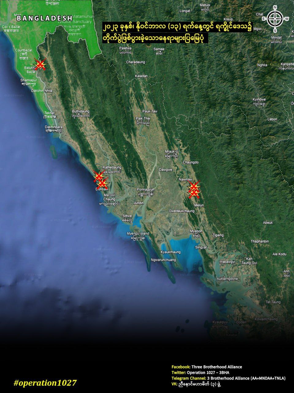 ၁၀၂၇ စစ်ဆင်ရေးကို တစ်နိုင်ငံလုံးအနှံ့ ဆင်နွဲသွားမည်ဟု ညီနောင်သုံးဖွဲ့က ထုတ်ပြန်ပြီးနောက်ပိုင်း ယနေ့ နံနက်ပိုင်းမှစတင်ကာ ရခိုင်ပြည်အတွင်း စစ်ကောင်စီနှင့် ရက္ခိုင့်တပ်တော် (AA) တို့ကြား တိုက်ပွဲများ စတင်ဖြစ်ပွားခဲ့သည်။