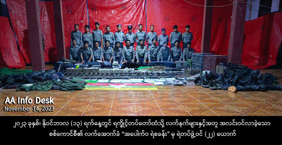 ယမန်နေ့က ရခိုင်ပြည်အတွင်း ရသေ့တောင်၊ မောင်တောနှင့် မင်းပြားမြို့နယ်ရှိ နေရာ (၅) ခု၌ တိုက်ပွဲဖြစ်ပွားခဲ့ပြီး ရသေ့တောင်မြို့နယ်ရှိ ဒုံးပိုက်နယ်ခြားစောင့်တပ်စခန်းအား ယင်းနေ့၌သိမ်းပိုက်ရရှိခဲ့ပြီး ချိန်ခါလိန် နယ်ခြားစောင့် တပ်စခန်းကို ယနေ့ နိုဝင်ဘာလ ၁၄ ရက်နေ့ နံနက်ပိုင်းတွင် အပြီးသတ်သိမ်းပိုက်ခဲ့ကြောင်း AA က ပြောသည်။
