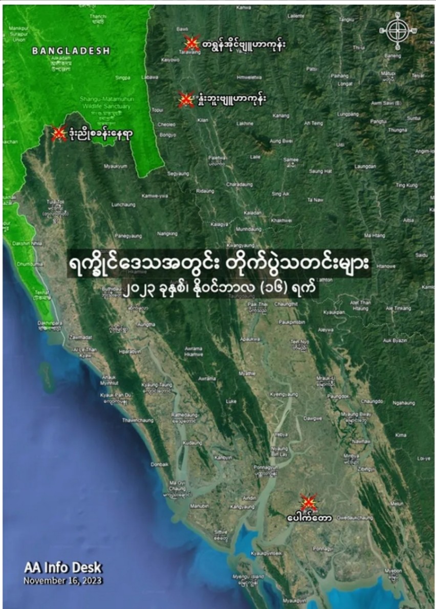 ၂၀၂၃ ခုနှစ်၊ နိုဝင်ဘာလ (၁၆) ရက်နေ့၊ ရက္ခိုင်ဒေသအတွင်း ဖြစ်ပွားနေသာ တိုက်ပွဲသတင်းများနှင့် ပတ်သက်ပြီး  ရက္ခိုင့်တပ်တော် (AA)က သတင်း ထုတ်ပြန်သည်။