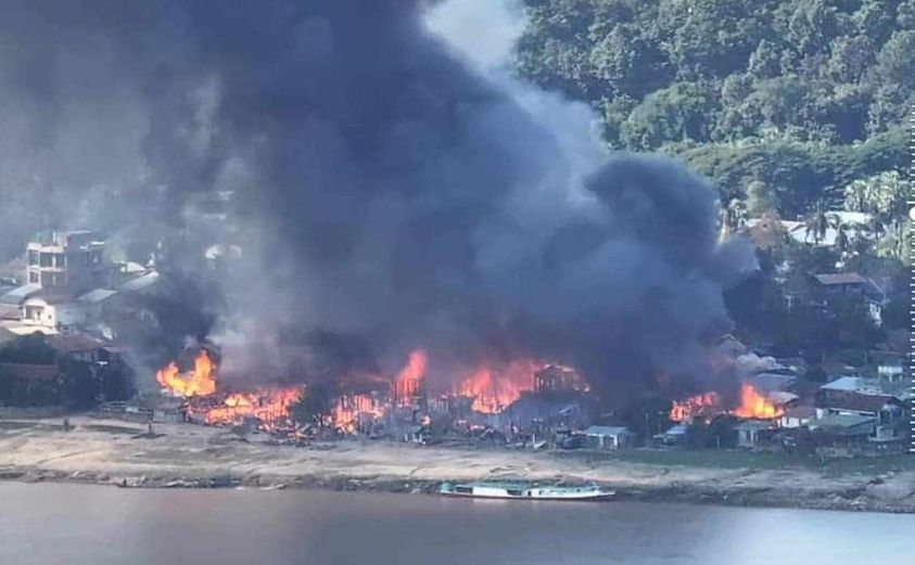 စစ်ကောင်စီ၏ လေကြောင်းတိုက်ခိုက်မှုကြောင့် မီးလောင်နေသည့်  နေအိမ်များ