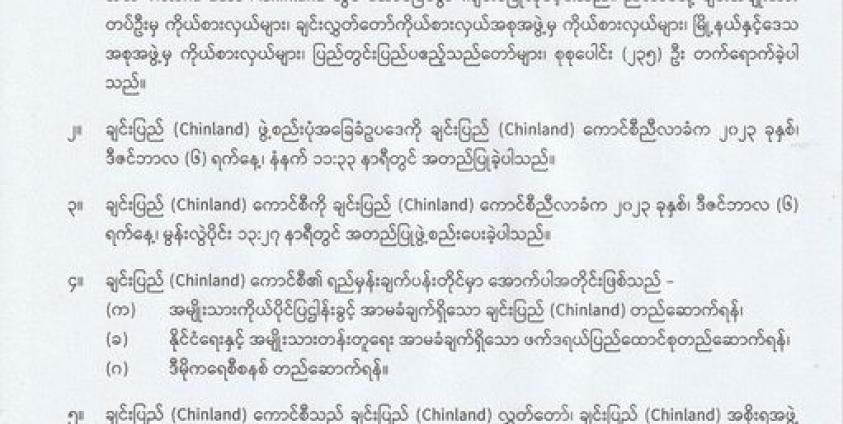 ပထမအကြိမ် ချင်းပြည်ကောင်စီညီလာခံကို ဒီဇင်ဘာလ (၄) ရက်နေ့ကနေ (၇) ရက်အထိ Victoria Base ၊ Chineland မှာ ကျင်းပခဲ့ပြီး ချင်းအမျိုးသားတပ်ဦးက ကိုယ်စားလှယ်တွေ၊ ၂၀၂၀ ရွေးကောက်ပွဲအနိုင်ရ ချင်းလွှတ်တော်ကိုယ်စားလှယ်အစုအဖွဲ့က ကိုယ်စားလှယ်၊ မြို့နယ်နဲ့ ဒေသအစုအဖွဲ့က ကိုယ်စားလှယ်၊ ပြည်တွင်းပြည်ပဧည့်သည် စုစုပေါင်း (၂၃၅) ဦး တက်ရောက်ခဲ့တယ်လို့ ထုတ်ပြန်ထားပါတယ်။