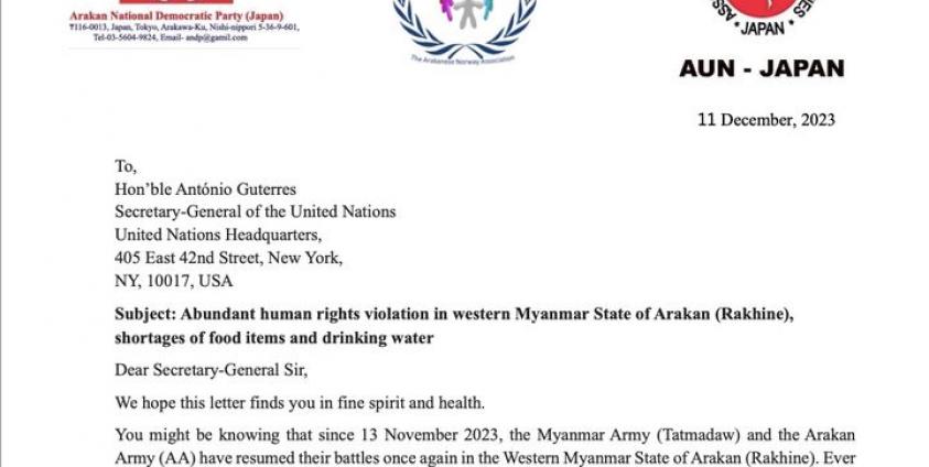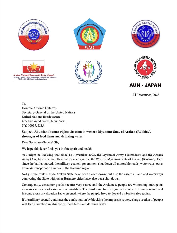 ပေးပို့ သည့်စာထဲတွင် မြန်မာနိုင်ငံ အနောက်ဘက် ရခိုင်ပြည်နယ်တွင် နိုဝင်ဘာ (၁၃ ) ရက်နေ့က စတင်ပြီး မြန်မာတပ်မတော်နှင့် ရက္ခိုင့်တပ်တော် (အေအေ) တို့အကြား တိုက်ပွဲများ တစ်ဖန် ပြန်လည် စတင် ဖြစ်ပွားခဲ့ပါကြောင်း၊ ထိုတိုက်ပွဲဖြစ်ပွားသည့် နေ့မှ စ၍ အာဏာသိမ်းယူထားသည့် စစ်ကောင်စီသည် ရခိုင်ပြည်တွင် လူ့အခွင့်အရေးများကို ချိုးဖောက်ကျူးလွန်နေပါကြောင်း၊ ထိုသို့ ကျူးလွန်ရာတွင် ပြည်သူများသွားလာ အသုံးပြုနေသည့် ကားလမ်း၊ ရေလမ်း ခရီးလမ်းကြောင်းနှင့် သယ်ယူ ပို့ဆောင်ရေး လမ်းကြောင်းများအားလုံးကို ပိတ်ဆို့ ထားပါကြောင်း၊ သို့အတွက် ရခိုင်ပြည်နယ်တွင် အစားအစာများ ရှားပါးကာ အငတ်ဘေး ကျရောက်ရန် အခြေအနေနှင့် ကြုံတွေ့နေရပါကြောင်း၊ ပြည်သူများ အဓိက လိုအပ်နေသည့် ဆန်ရိက္ခာမှာ အလွန်ရှားပါးသွားပြီး တချို့ဒေသများတွင် ဆန်ဝယ်၍ မရသဖြင့် ဆန်ကွဲကို ကျိုသောက်ရသည့် အနေအထားသို့ ကျရောက်နေပါကြောင်း ဖော်ပြပါရှိသည်။