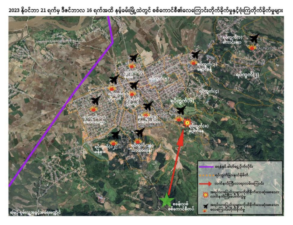 လက်ရှိ ညီနောင်မဟာမိတ်သုံးဖော် အလုံးစုံထိန်းချုပ်ထားသည့် နမ့်ခမ်းမြို့ကလည်း ၎င်းတို့မထိန်းချုပ်နိုင်ခင် ဒီဇင်ဘာလ ၁၆ ရက်က စစ်ကောင်စီသည် ရေနံနှင့် သဘာဝဓာတ်ငွေ့ ပိုက်လိုင်းနှင့် မီသာ ၄၀ သာကွာဝေးတဲ့ နမ့်ခမ်းမြို့နယ် ဟိုနားကျေးရွာကို လေကြောင်းဖြင့် ဗုံးကြဲတိုက်ခိုက်ခဲ့ရာ အရပ်သား ၅ ဦးသေဆုံးခဲ့ပြီး ၄ ဦးထိခိုက်ဒဏ်ရာရရှိကြောင်း ထုတ်ပြန်ချက်၌ ရေးသားဖော်ပြထားသည်။