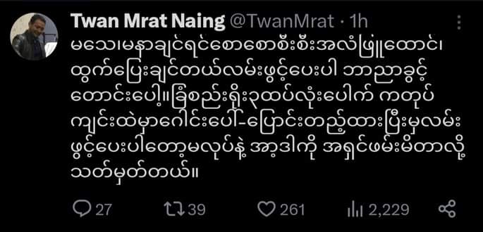စစ်ကာင်စီတပ်သားများကို ရည်ရွယ်ပြီး ရက္ခိုင့်တပ်တာ် (AA) စစ်ဦးစီးချုပ် ဗိုလ်ချုပ်ထွန်းမြတ်နိုင်က မသေ၊မနာချင်ရင် စောစောစီးစီး အလံဖြူထောင်ရန် သူ၏တွစ်တာမှ တစ်ဆင့် ရေးသား တိုက်တွန်းလိုက်သည်။