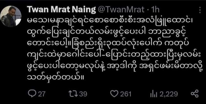 "မသေမနာချင်ရင် စောစောစီးစီးအလံဖြူထောင်၊ ထွက်ပြေးချင်တယ် လမ်းဖွင့်ပေးပါ ဘာညာခွင့်တောင်းပေါ့ " ဟု ရေးသားထားသည်။
