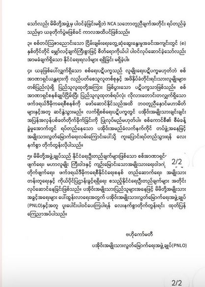 NCA လက်မှတ်ရေးထိုးခဲ့ချိန်မှ လက်ရှိ အချိန်အထိ ရှစ်နှစ်ကြာ NCA စာချုပ်ကို မချိုးဖောက်ဘဲ ရပ်တည်ခဲ့သော်လည်း အာမခံချက်ရှိသည့် နိုင်ငံရေးရလာဒ် မရခဲ့ဟု (PNLO) ၏ ထုတ်ပြန်ချက်တွင် ဖော်ပြသည်။