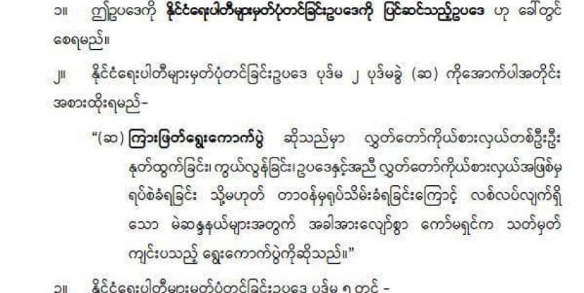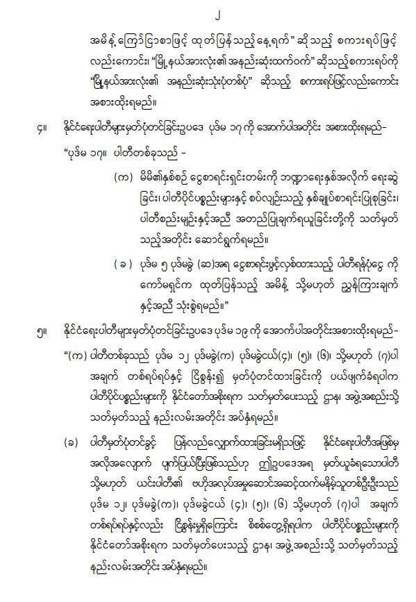 အခုပြင်ဆင်လိုက်တဲ့ဥပဒေမှာ နိုင်ငံရေးပါတီများမှတ်ပုံတင်ခြင်းဥပဒေပုဒ်မ(၅) ပုဒ်မခွဲ(စ)မှာပါတဲ့ “ရက်ပေါင်း၉၀”ဆိုတဲ့စကားရပ်ကို “ရွေးကောက်ပွဲကျင်းပမည့်နေ့မတိုင်မီ အနည်းဆုံးရက်ပေါင်း (၉၀)” ကြိုတင်ပြီး ကော်မရှင်က မိန့်ကြော်ငြာစာဖြင့် ထုတ်ပြန်သည့်ရက်နေ့”ဆိုတဲ့စကားရပ်ကိုပြင်ဆင်ထားပါတယ်။ အဲ့ဒီအပြင် ပါတီဝင်ဦးရေအနည်းဆုံး ၁၀၀၀၀၀ ဆိုသည့်စကားရပ်ကို ပါတီဝင်ဦးရေ အနည်းဆုံး(၅၀၀၀၀)ဆိုသည့် စကားရပ်ဖြင့်ပြင်ဆင်ခဲ့တာဖြစ်ပါတယ်။