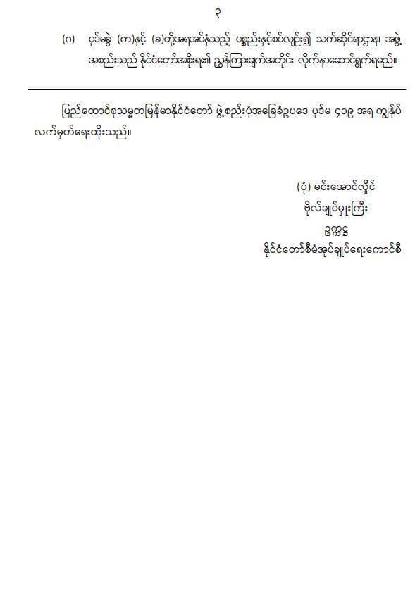 “ပုဒ်မခွဲ(ဇ)ပါရှိတဲ့ရက်ပေါင်း “(၁၈၀)”ဆိုတဲ့စကားရပ်ကို “ရွေးကောက်ပွဲကျင်းပမည့် နေ့ရက်မတိုင်မီအနည်းဆုံး ရက်ပေါင်း(၉၀) ကြိုတင်ပြီးကော်မရှင်က အမိန့်ကြော်ငြာစာဖြင့် ထုတ်ပြန်သည့်နေ့ရက်” ဆိုသည့် စကားရပ်ဖြင့် လည်းကောင်း “မြို့နယ်အားလုံးရဲ့အနည်းဆုံးထက်ဝက်ဆိုသည့်စကားရပ်ကို မြို့နယ်အားလုံးရဲ့ အနည်းဆုံးသုံးပုံ တစ်ပုံဆိုတဲ့စကားရပ်နဲ့ပြင်ဆင်ဖွဲ့စည်းခဲ့ပါတယ်။