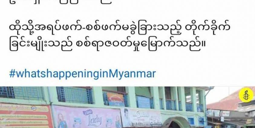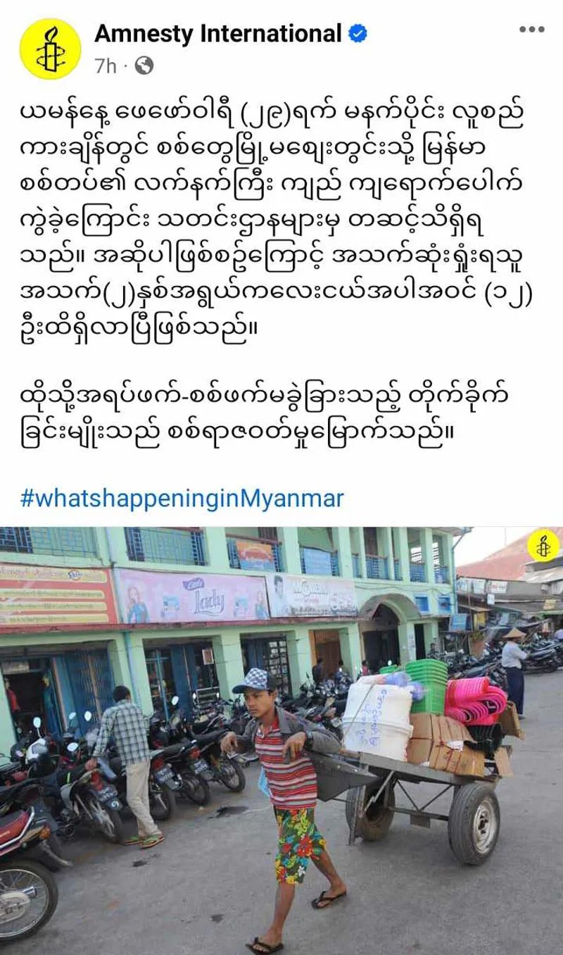 အပြည်ပြည်ဆိုင်ရာလွတ်ငြိမ်းချမ်းသာခွင့်အဖွဲ့ ၏ ထုတ်ပြန်ချက်အထဲတွင်  "ယမန်နေ့ ဖေဖော်ဝါရီ (၂၉)ရက် မနက်ပိုင်း လူစည်ကားချိန်တွင် စစ်တွေမြို့မစျေးတွင်းသို့ မြန်မာစစ်တပ်၏ လက်နက်ကြီး ကျည် ကျရောက်ပေါက်ကွဲခဲ့ကြောင်း သတင်းဌာနများမှ တဆင့်သိရှိရသည်။ အဆိုပါဖြစ်စဥ်ကြောင့် အသက်ဆုံးရှုံးရသူ အသက်(၂)နှစ်အရွယ်ကလေးငယ်အပါအဝင် (၁၂) ဦးထိရှိလာပြီဖြစ်သည်။ ထိုသို့ အရပ်ဘက်-စစ်ဘက်မခွဲခြားသည့် တိုက်ခိုက်ခြင်းမျိုးသည် စစ်ရာဇဝတ်မှုမြောက်သည်” ဟု ဆိုသည်။