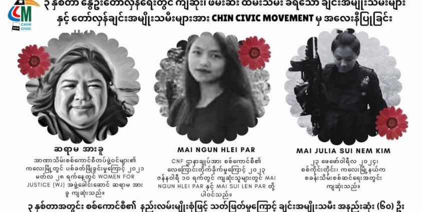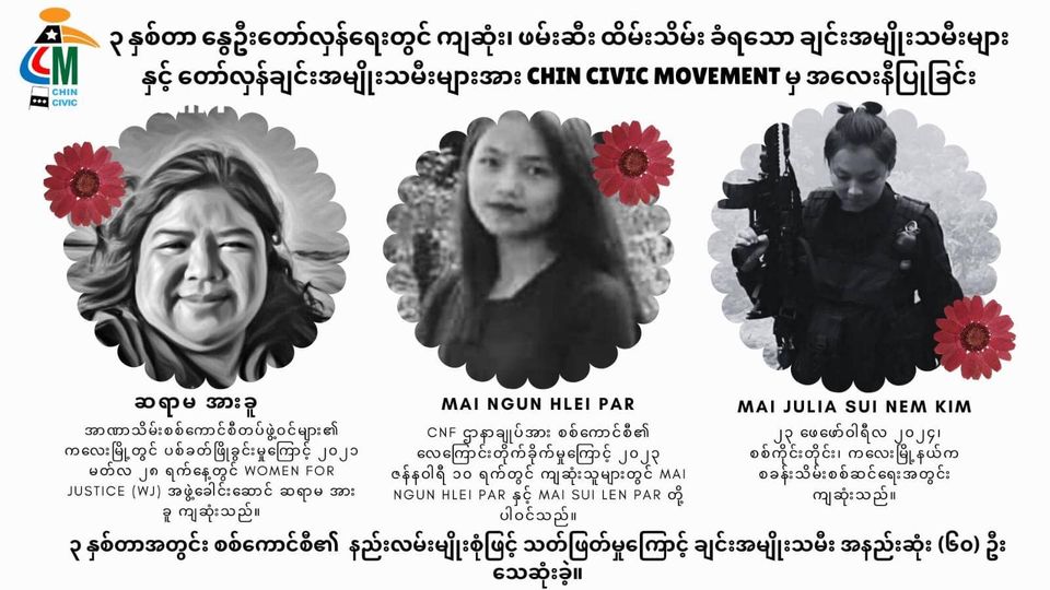အာဏာသိမ်း ၃ နှစ်တာအတွင်း စစ်ကောင်စီက ချင်းအမျိုးသမီး ၆၀ ဦးထက်မနည်းကို သတ်ဖြတ်မှု ကျူးလွန်ထားပြီး ချင်းအမျိုး သမီး ၃၀ ဦးထက်မနည်းက နိုင်ငံတဝန်းက အကျဉ်းထောင်တွေထဲ ဖမ်းဆီးထိန်းသိမ်းခံထားရကြောင်း Chin Civic Movement က ယနေ့မှာ သတင်းထုတ်ပြန်သည်။