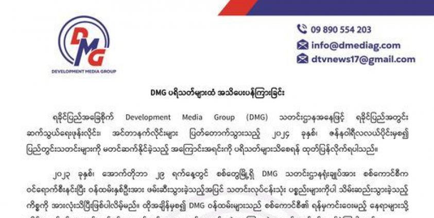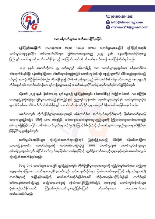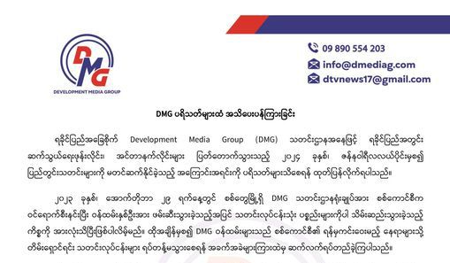 ရခိုင်ပြည်အခြေစိုက် Development Media Group (DMG) သတင်းဌာနအနေဖြင့် ရခိုင်ပြည်အတွင်း ဆက်သွယ်ရေးဖုန်းလိုင်း၊ အင်တာနက်လိုင်းများ ပြတ်တောက်သွားသည့် ၂၀၂၄ ခုနှစ်၊ ဇန်နဝါရီလလယ်ပိုင်းမှစ၍ ပြည်တွင်းသတင်းများကို မတင်ဆက်နိုင်ခဲ့သည့် အကြောင်းအရင်းကို ပရိသတ်များသိစေရန် ထုတ်ပြန်လိုက်ရပါသည်။