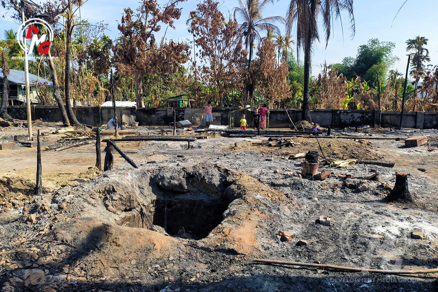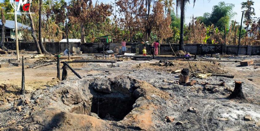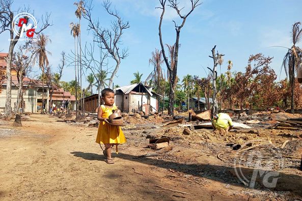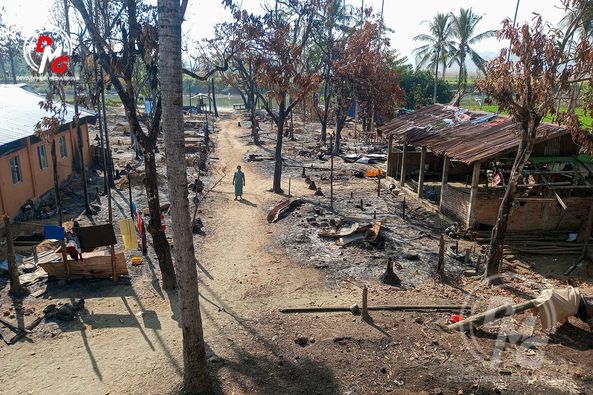 စစ်ကောင်စီပစ်ခတ်သည့် လက်နက်ကြီးကျည်များ ကျရောက်ပေါက်ကွဲမှုကြောင့် ရခိုင်ပြည်၊ ကျောက်တော်မြို့နယ်၊ ကန်စောက်ကျေးရွာ၌ မီးလောင်ပြာကျ ပျက်စီးသွားသည့် စစ်ဘေးရှောင်စခန်း၊ ဘုန်းတော်ကြီးကျောင်းနှင့် နေအိမ်အချို့ကို ယခုနှစ်၊ ဇန်နဝါရီ ၂၉ ရက်တွင် တွေ့မြင်ရခြင်းဖြစ်သည်။