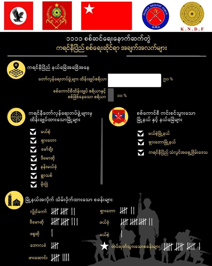 “ သိမ်းပိုက်ထားတဲ့ စခန်း (၆၅)ခုထဲမှာ တချို့ စခန်းတွေကတော့ အထိုင်စခန်းတွေဖြစ်တယ်။ တချို့ကျတော့လည်း ဗျူဟာကုန်းစခန်းတွေဖြစ်တယ်ပေါ့။ တချို့ကျတော့လည်း နှစ်ရှည်လများ အခြေပြုတပ်စွဲထားတဲ့ နေရာတွေ၊ ကျေးရွာတွေ၊ စစ်ဆေးရေးဂိတ်တွေဖြစ်တယ်ပေါ့။ စစ်ကြောင်းထိုးပြီးတော့ အခြေစိုက်တပ်စွဲထားတဲ့နေရာတွေလည်းပါတယ်။ “ လို့ (KNDF)သတင်းနဲ့ ပြန်ကြားရေးတာဝန်ရှိသူတစ်ဦးက ပြောပါတယ်။